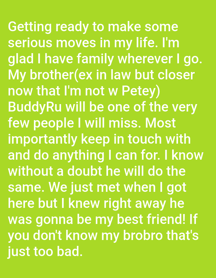 The image contains a block of text on a lime green background. The text reads: "Getting ready to make some serious moves in my life. I'm glad I have family wherever I go. My brother (ex in law but closer now that I'm not w Petey) BuddyRu will be one of the very few people I will miss. Most importantly keep in touch with and do anything I can for. I know without a doubt he will do the same. We just met when I got here but I knew right away he was gonna be my best friend! If you don't know my brobro that's just too bad." The text is about a person's feelings toward a friend, expressing their appreciation for their friendship and the importance of staying connected. The coordinates provided are for the city of Tacoma, Washington, but the image itself contains no locational information.