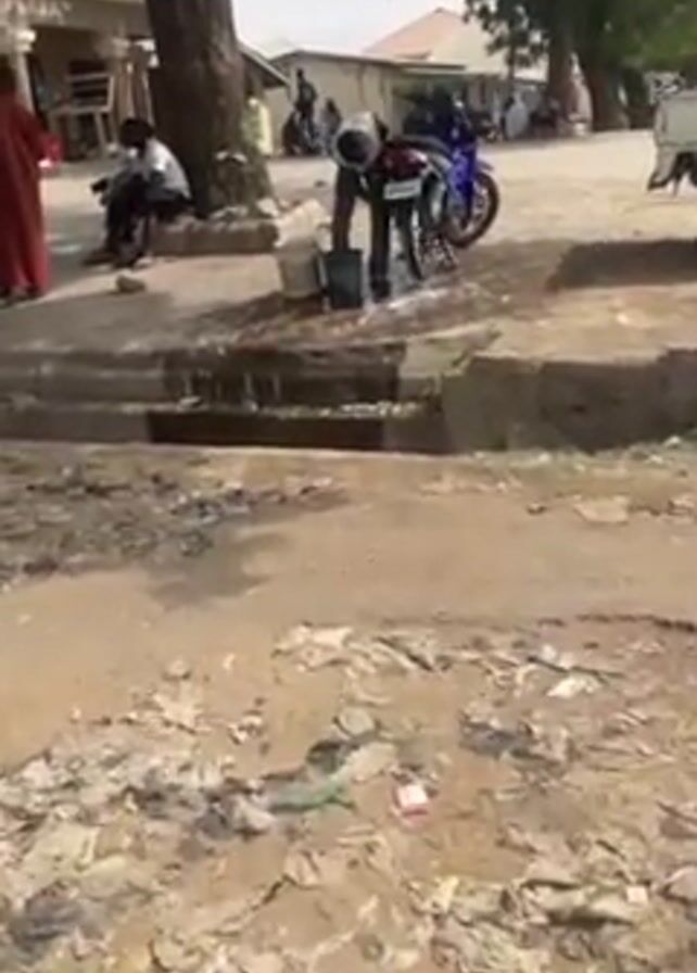 man washing a motorcycle on a street. The motorcycle is parked next to a curb with a drainage ditch. The man is using buckets of water and a cloth to wash the motorcycle. There is trash and debris on the ground around the curb. There are several other people in the background, some sitting and some standing. There is a tree in the foreground and several buildings in the background. The sky is overcast.