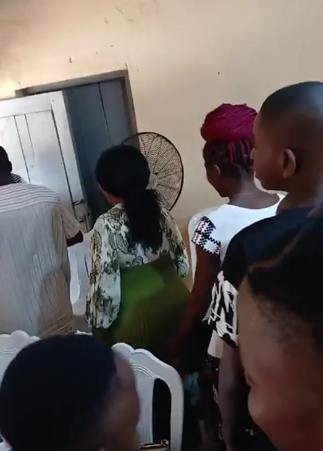 group of people standing and moving in a room. Some people are standing near white plastic chairs. A woman in a white patterned shirt and green skirt stands with her back to the camera, along with another woman wearing a white top and a red head covering. A man in a white shirt walks toward a door. Several children are also visible in the crowd. A standing fan is in the background. The room appears to be indoors with light-colored walls. Loud music is audible.