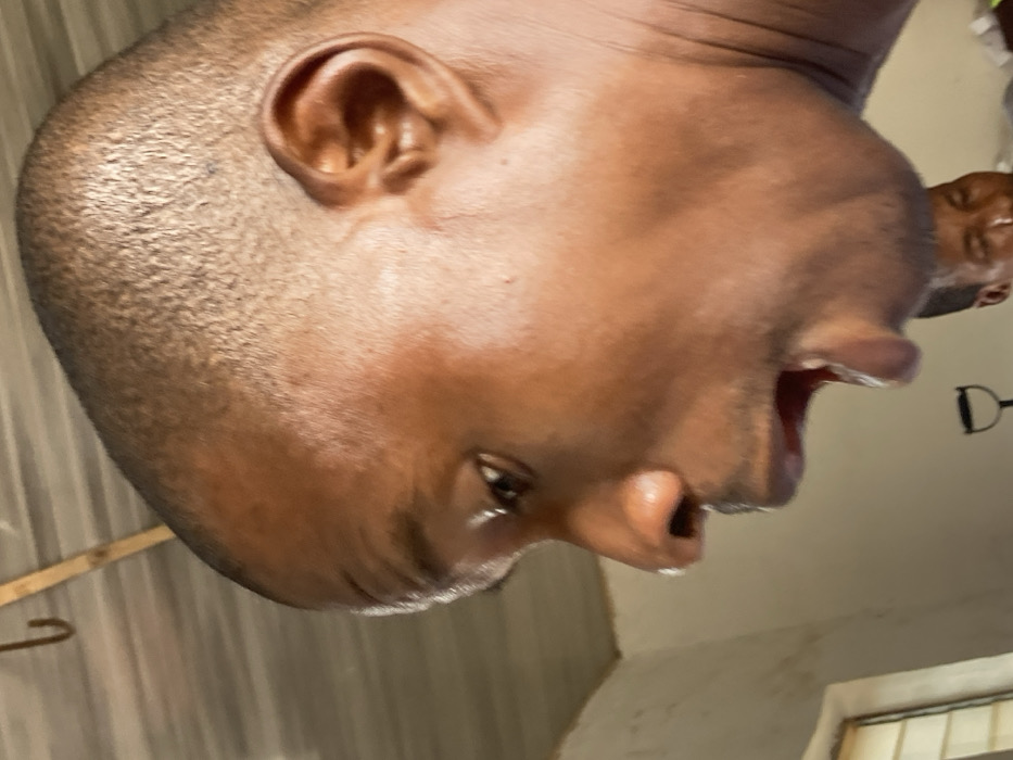 The image depicts two dark-skinned adult males in an indoor setting within Agege, Nigeria. The primary subject, in the foreground and occupying most of the frame, is seen in a right-profile close-up. He possesses a closely cropped haircut and is angled downwards, with his mouth wide open, indicating an exclamatory or reactive state. His right eye is visible, directed downwards. In the lower background, a second dark-skinned male is partially visible, oriented upwards towards the primary subject, with only his forehead and eyes discernible. The environment features a corrugated metal sheet ceiling in the upper left, supported by a wooden beam, from which a metal hook is suspended. The walls are light-colored, suggesting painted concrete. A window with horizontal bars is visible on the left. A black, D-shaped handle is present in the lower-middle background.