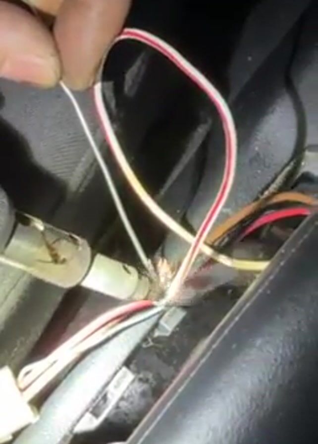 A hand is seen holding a white wire with red stripes to a cluster of wires. A soldering iron is being used to connect the wires together. The wires are located in a dark space, and other colored wires such as red, yellow, white, and black are visible. There is a black plastic component nearby, as well as debris on the surrounding surface. The soldering process emits smoke and sparks.