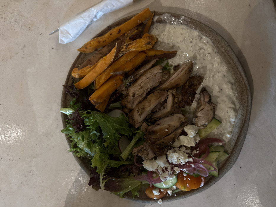 An overhead photograph depicts a prepared meal presented on a round, rustic-edged, earthy-toned plate. The plate, situated on a light-colored, textured surface, features sliced, seasoned grilled chicken breast or thigh meat arranged over a base of creamy white sauce, consistent with tzatziki. To the left of the chicken, a fresh green salad includes mixed greens, sliced cucumbers, halved orange-red cherry tomatoes, thinly sliced red onions, and crumbled white feta cheese. To the right, a pile of golden-orange sweet potato fries, some with visible skin, occupies a section of the plate. A folded white paper napkin with a silver knife protruding from it rests to the upper right of the plate. The scene takes place in a dining establishment or private residence within Miami, United States of America.