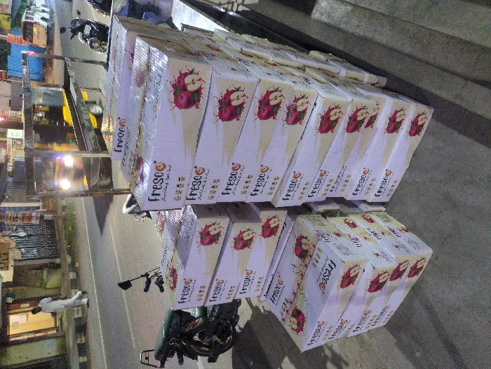 This image depicts an urban street scene in Tiruvannamalai, India, observed at night. In the foreground, numerous white cardboard boxes, branded "Fresco" and displaying red apple graphics, are stacked. These stacks are positioned on a grey concrete pavement, with a large group of boxes extending onto a stainless steel-colored cart frame on the right. In the mid-ground, an asphalt road features a yellow auto-rickshaw with illuminated headlights traveling away from the viewer. A white vehicle with active headlights is visible further down the street on the right. Two dark-colored motorcycles are parked: one on the left side of the foreground, and another near the metal cart on the right. One adult male, dressed in white attire, walks from left to right on the pavement in the mid-ground. Commercial buildings with interior lighting are visible lining the street in the background.