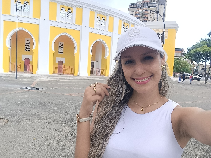 A woman in a white tank top and a Mercedes-branded white cap smiles for a selfie. Behind her is a yellow and white Moorish-style building with arched entrances. The square is paved. In the background, there are buildings, people walking, trees, and cars. The woman wears a watch, rings, and a gold necklace. Her blonde hair is wavy.