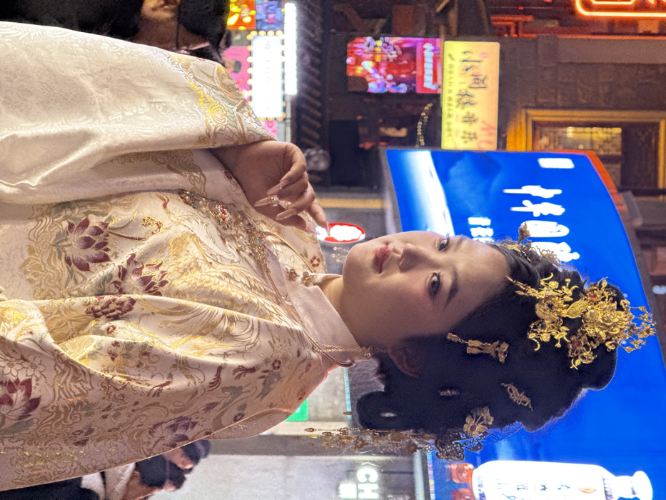 An East Asian female is depicted in a night urban setting within Yuzhong District, China, captured from the mid-chest up. She is positioned slightly angled to the left, with her head turned away from the camera, eyes directed leftward. Her dark hair is styled into an elaborate updo, adorned with an ornate golden headpiece featuring intricate scrollwork, red gemstone accents, and multiple dangling elements. She wears a traditional-style, high-collared gown in a white or cream hue, richly embroidered with patterns of golden phoenixes and purple and green lotus flowers. A detailed golden necklace or chest ornament is visible over her garment. Her visible right hand is raised, with the index finger slightly extended and her thumb touching her chin area; she has long, clear-colored acrylic nails. Gold earrings with dangling components are visible on both ears. The background is a brightly lit cityscape at night, featuring a prominent large blue billboard with white Chinese characters behind her head. To the left, numerous smaller illuminated signs with Chinese text in red, yellow, and white are visible, along with parts of a stone or brick building. Blurred figures of other individuals are discernible in the far background, indicating a populated public area.