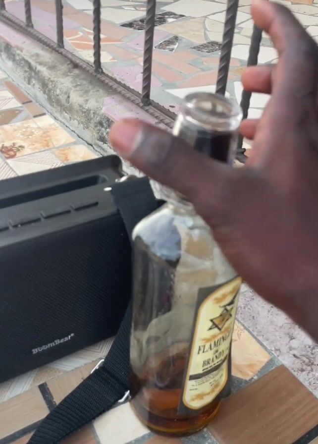 A brown bottle of brandy sits next to a BoomBass Bluetooth speaker, a white charging cable, and a short section of wrought iron fence on a tiled porch. A hand picks up the bottle and then the camera pans away to children playing. Two boys are seen together on a bicycle, one pushing it, on a sand street. A third boy watches them from the porch. Houses and a school are seen in the background. The sky is overcast.
