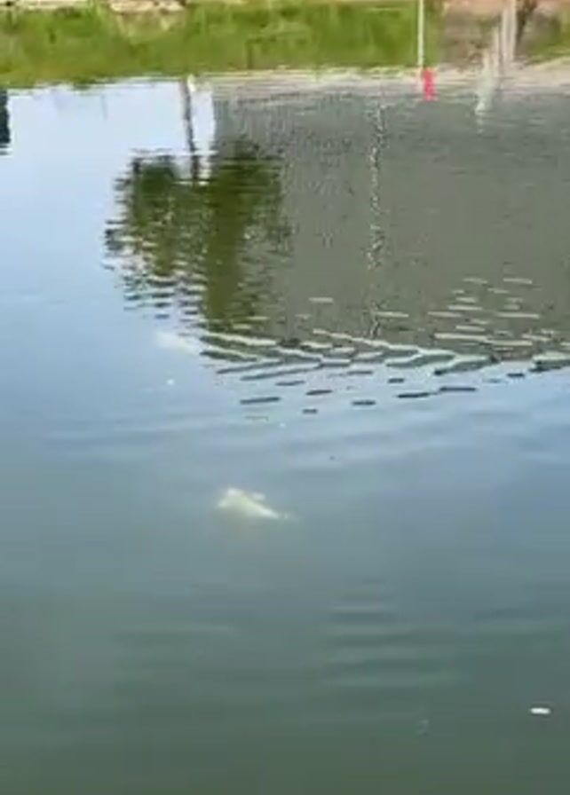 lake on a sunny day. Initially, a light-colored shape is faintly visible under the water. The camera pans to the right. A duck swims into view on the right side of the frame. The lake reflects the trees and the cloudy sky. The shore includes grassy areas and wooden fences.