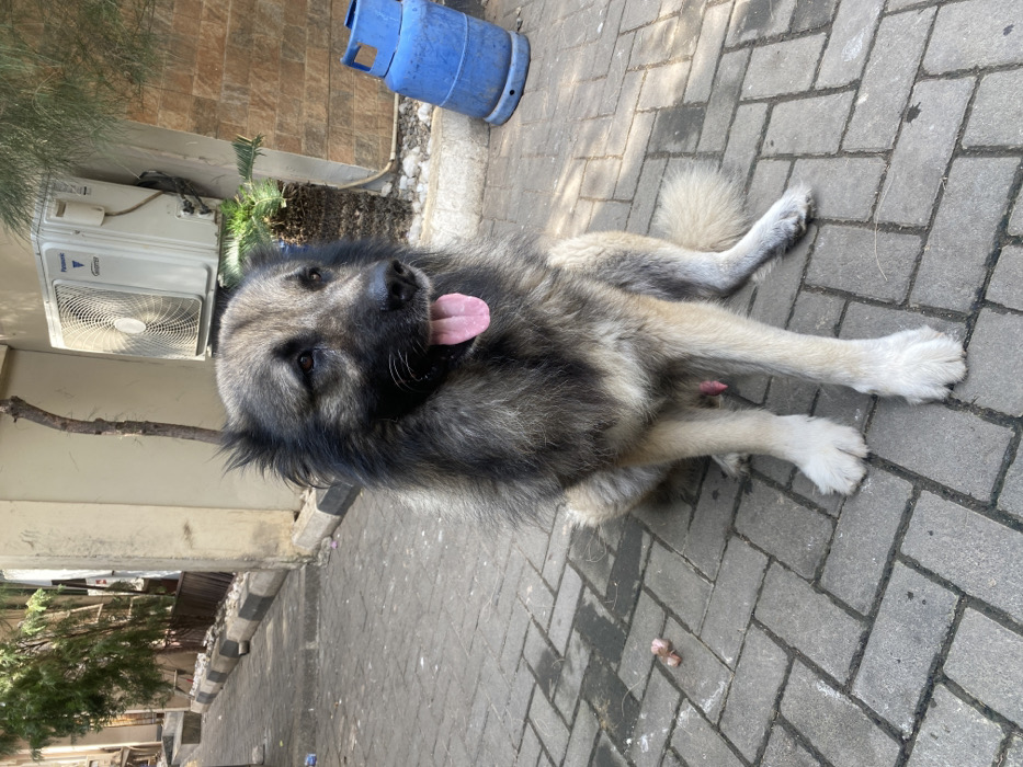 - "A large, long-haired male dog with a gray and black coat sits on a paved surface made of interlocking gray blocks" by FM-ECVX42, licensed under CC BY 4.0