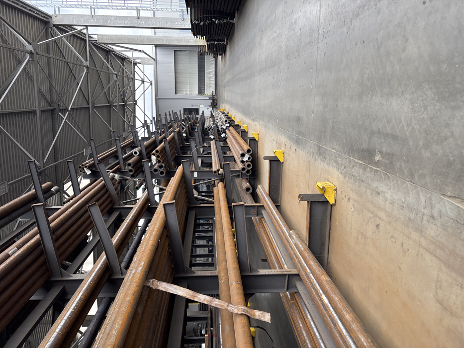 The image displays the interior of a large industrial storage facility located in Ruptsi, Bulgaria. The foreground and midground on the left are dominated by multiple dark grey cantilever racking units, extending longitudinally into the background. These racks are densely loaded with various sizes of metal pipes, primarily exhibiting a reddish-brown rust patina. A pipe on the lowest foreground rack is partially secured by a yellow strap. Several loose pipes are resting on the concrete floor in front of the lower rack sections, stabilized by yellow chocks. To the right, a wide, clear concrete aisle extends into the distance. In the far right background, stacks of dark, flat sheet or plate material are visible. The facility features a high, light grey corrugated metal roof supported by an exposed steel truss system. A large, closed grey industrial door is visible in the distant background wall. No personnel or active operations are present within the scene.