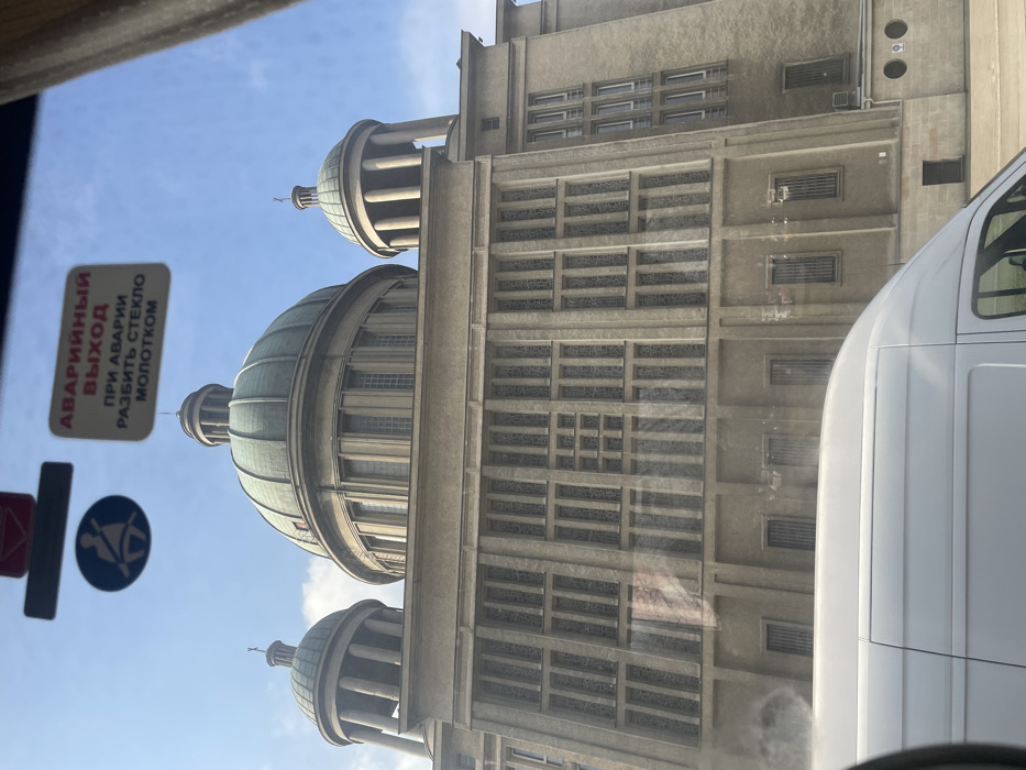 The image displays the Archcathedral Basilica of St. Stanislaus Kostka, located at Piotrkowska 265, 90-349 Łódź, Poland, observed from an interior vehicle perspective. The cathedral's upper section is prominent, featuring a large central dome and two smaller, columned domes, all with a weathered copper-green patina. The building's facade is a muted, light grey or beige, characterized by multiple levels of vertically elongated, rectangular windows, some displaying a grid-like pattern. The sky above is clear blue with minimal cloud cover. In the foreground, the roof and upper side panels of a white cargo van are visible, partially obscuring the lower portion of the cathedral. Reflections on the viewing vehicle's window glass are present. Affixed to the upper interior of the window are two informational stickers: a circular blue sticker with a white pictogram of a person wearing a seatbelt, and a rectangular red and white sticker with Russian text reading "АВАРИЙНЫЙ ВЫХОД ПРИ АВАРИИ РАЗБИТЬ СТЕКЛО МОЛОТКОМ" (EMERGENCY EXIT IN CASE OF EMERGENCY BREAK GLASS WITH HAMMER). No people are visible within the frame.