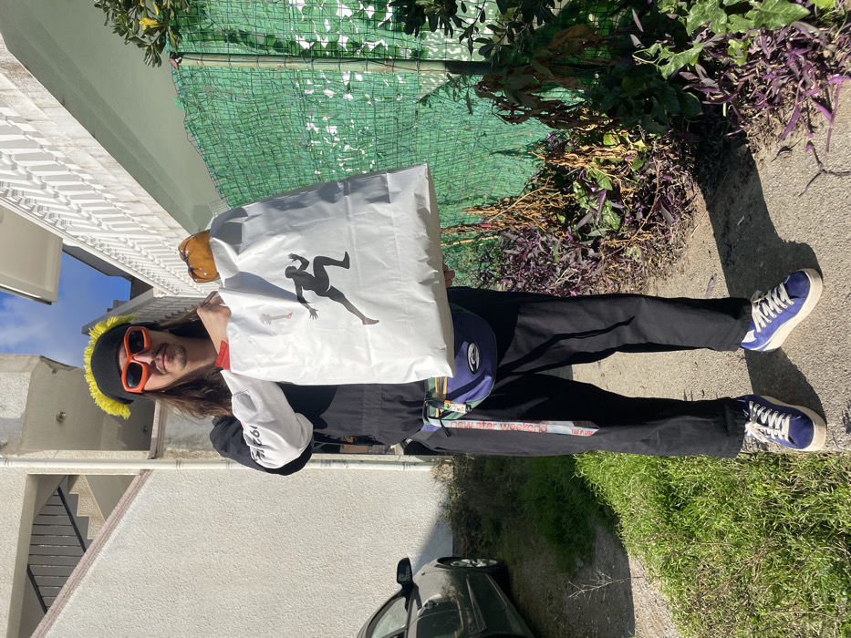 The image depicts one male subject standing outdoors in a residential area of Budva, Montenegro, under direct sunlight on a clear day. The subject, apparent age range 20-40 years, has long, dark brown hair, a mustache, and sparse beard. He wears a black knit beanie with yellow fringe, orange-framed wraparound sunglasses, a black sleeveless garment over a white long-sleeved shirt with the number "193" printed in black on the outer left sleeve, loose-fitting black trousers, and blue low-top sneakers with white soles and laces. Around his waist, he wears a multi-colored fanny pack (primarily blue with green, yellow, and white accents) from which a decorative strap, primarily white with red text, hangs down his left side. The subject holds a large white paper shopping bag with both hands, positioned at waist height and presented towards the viewer. The bag features a black silhouette graphic of a person in a running posture. A large, golden-brown, round baked item, resembling bread or a pastry, protrudes from the top opening of the bag. The background on the left consists of a multi-story building with a light-colored facade and an external staircase. A dark-colored sedan is partially visible on the far left, parked on an unpaved, grassy area. To the right, another light-colored building features a white decorative railing or balustrade along its upper story. In the mid-ground right, a green mesh fence or screen supports dense green foliage, below which ground vegetation includes vibrant green and reddish-purple leafy plants, with some areas exhibiting dried foliage. The subject stands on a light grey paved surface, bordered by sparse green grass and weeds to the left. The sky overhead is clear blue with scattered white cumulus clouds.
