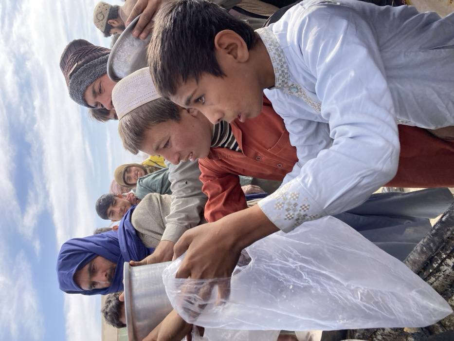 The image depicts an outdoor scene in Chaman City Tehsil, Pakistan, featuring a group of approximately ten individuals, primarily males, gathered under a partly cloudy blue sky. In the foreground, a man with a dark beard, wearing a blue headscarf and a light-colored jacket, holds a large, silver-toned metal pot with both hands. To his immediate right, a male juvenile, appearing between 10-14 years old and dressed in an orange long-sleeved shirt over a striped undershirt, extends his right arm. Positioned next to him is a younger male juvenile, aged approximately 7-11, wearing a light blue embroidered shalwar kameez and a white kufi cap. This younger juvenile holds open a translucent plastic bag with both hands, angled upwards. Behind these individuals, another adult male with a dark knitted hat holds a smaller silver-toned metal bowl. Additional individuals are visible in the background, observing the activity. The arrangement of people and objects suggests a distribution or collection event.