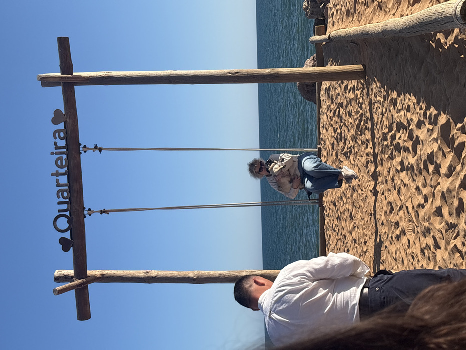 The image displays an outdoor scene on a clear, sunny day at a sandy beach in Quarteira, Portugal