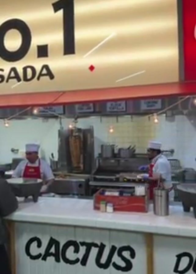 inside of a Cactus Taqueria. Behind the counter, two men wearing white uniforms and hats with red aprons are preparing food. One man is near a vertical rotisserie with meat spinning, while the other is at a griddle. Above the counter, signs read "Guacamole contains dairy" and "Contains pork lard," and "Corn or Flour Tortilla". The counter is decorated with a white and red pattern and the words "CACTUS" in large black letters. A Coca-Cola crate and various containers are on the counter.