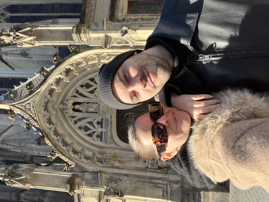 Two individuals, an adult male and an adult female, are positioned in a close-up selfie-style photograph. The scene is set in front of the Notre-Dame de la Treille Cathedral in Lille, France, identified by its distinctive Gothic architecture, including a pointed archway entrance with intricate stone tracery and a statue of a religious figure visible in a niche above a dark wooden door. The female, on the left, has dark hair pulled back and is wearing large, rectangular, tortoiseshell-patterned sunglasses. She is dressed in a dark top, possibly a sweater, layered under a light brown or beige coat featuring a prominent faux fur-lined hood. Her left arm is draped over the male's right shoulder, and her hand rests on his upper arm. She exhibits a subtle smile. The male, on the right, wears a dark grey or black beanie, a black ribbed turtleneck sweater, and a black leather jacket with a zippered front and a pointed collar. He has short dark hair and faint facial stubble. He also displays a subtle smile. Both individuals are looking directly towards the camera. Bright sunlight illuminates the scene from the left, highlighting the subjects and the detailed stone facade of the cathedral.