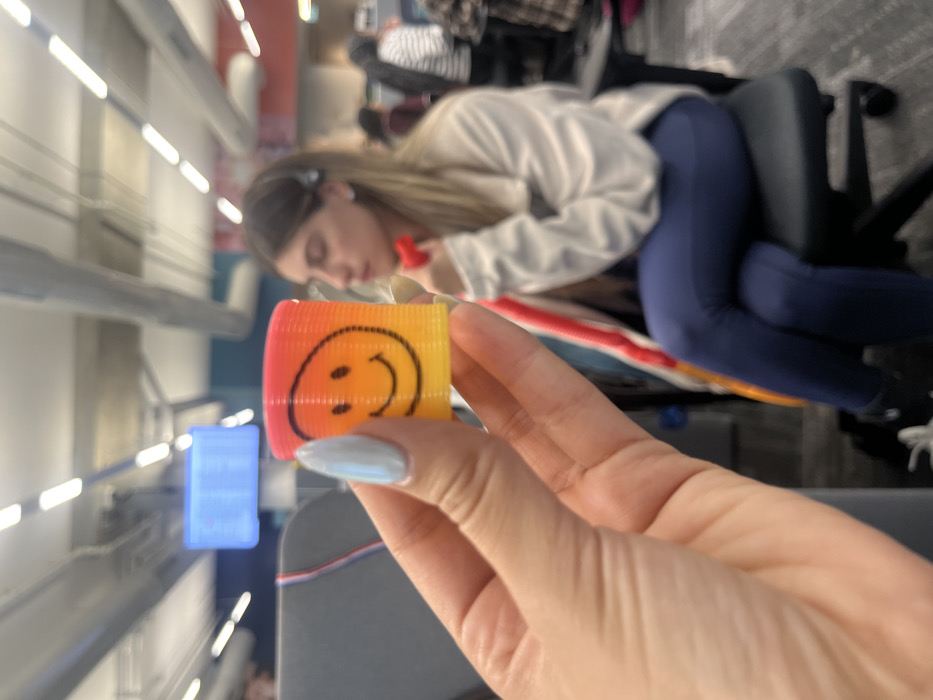 The image captures an indoor scene in Bnei Brak, Israel, likely an open-plan office environment. In the foreground, a left hand with pale skin and light blue/silver manicured fingernails holds a multi-colored coiled spring toy, commonly known as a Slinky. The Slinky exhibits a gradient of yellow at the bottom, transitioning to orange, and then pink at the top, with a black smiley face icon printed on its side. In the mid-ground, out of focus, a person with long light brown hair is seated in a black office chair. This individual wears a light-colored, possibly off-white, long-sleeved top or cardigan and dark blue leggings. They appear to be holding a small red object to their face or mouth. The background is further blurred, revealing elements typical of a modern office: linear fluorescent light fixtures on the ceiling, gray office partitions or cubicles, and a blue-lit digital display screen in the distance. Other indistinct figures and office furniture are visible, suggesting a populated workspace. The specific address or establishment within Bnei Brak is not discernible from the visual evidence.