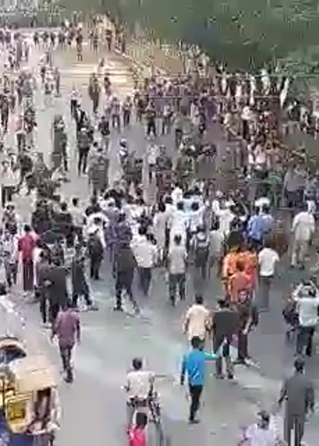 A large crowd of people is walking down a wide street. Most of the people are wearing casual clothing, with a mix of light and dark colors. The crowd seems densely packed, with people moving in the same general direction. Several people are visible along the edges of the crowd, walking on the periphery. A three-wheeled vehicle is parked on the left side. In the background, trees line the edges of the street. The camera angle is from above, looking down at the scene. The sounds of sirens are clearly audible.