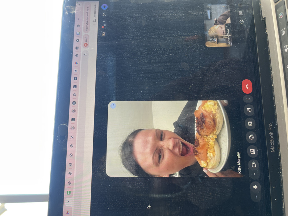 The image displays a MacBook Pro laptop screen captured in Santiago Yancuitlalpan, Mexico, showing an active Google Meet video call. The screen itself is significantly smudged and dusty. The main participant window, labeled "Kitty Murphy," shows a woman with dark hair, wearing a dark hoodie, holding a white plate with two English muffins topped with scrambled eggs and what appears to be smoked salmon and bacon bits. She is captured with her mouth wide open in an exaggerated expression. In the lower right corner, a smaller inset window displays "Marcella Chaya," a blonde individual leaning forward, looking intently into what appears to be a camera or phone. The laptop's built-in webcam has a black sliding privacy cover in the closed position. The browser's tab bar at the top of the screen shows multiple open tabs, predominantly Google services. The area above the laptop screen is overexposed white, suggesting a bright light source or window directly behind it.