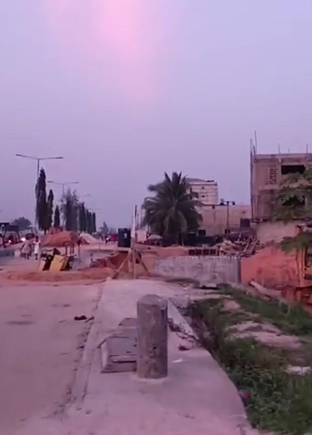 The video presents a static outdoor scene at what appears to be early evening or dusk, with a sky tinged with pink and purple hues. The setting is urban, showing ongoing road construction and building development alongside existing structures. In the foreground, there is a concrete sidewalk, partially obscured by sand and construction debris. A yellow XCMG excavator is parked on a dirt area adjacent to the sidewalk, next to a small tree and a pile of sand. In the background, a row of red vehicles, possibly taxis, is parked alongside the road, with people moving about near them. Streetlights are visible along the road. A concrete building is under construction and another building, seemingly a completed apartment or small hotel, stands on the right side of the frame. To the right of the excavator, there is a small, weathered building with a sloped roof and a partially visible group of people seated in front of it. The overall atmosphere suggests an urban area in transition, with active construction and ongoing daily life coexisting.