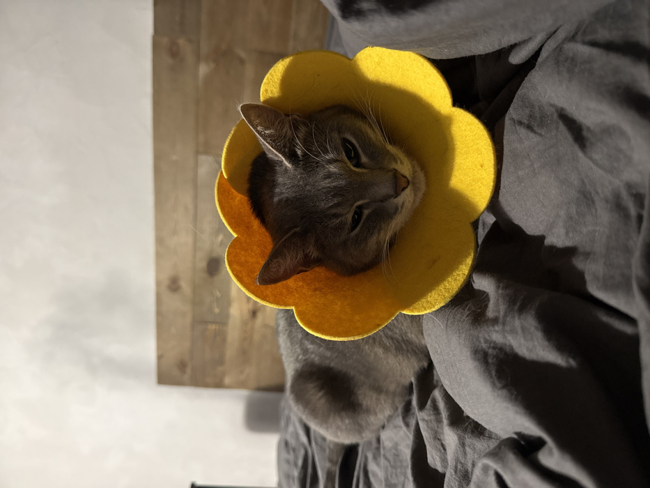 - "A grey tabby cat, wearing a bright yellow, flower-shaped Elizabethan collar, is lying prone on dark grey, rumpled bedding" by FM-m5rDi1, licensed under CC BY 4.0