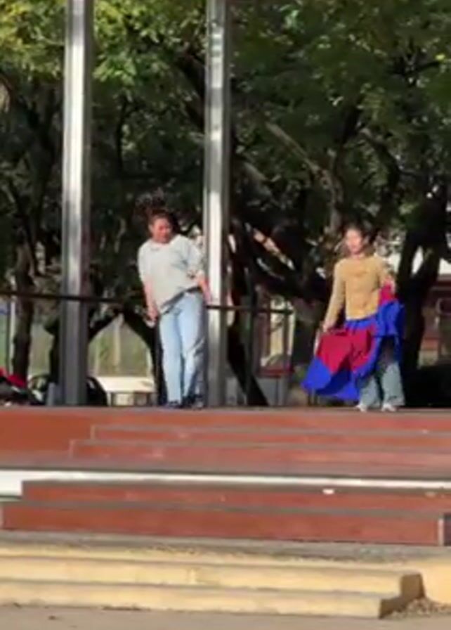 Two women are on a low outdoor stage made of brown steps. The woman on the left is wearing light blue jeans and a grey shirt, and the woman on the right is wearing a brown jacket and a long skirt that is blue on the bottom and red in the middle. They are holding hands and moving in a circle. The stage is within a structure made of silver posts. There are trees visible in the background. The ground in front of the stage is paved. It is a bright day.