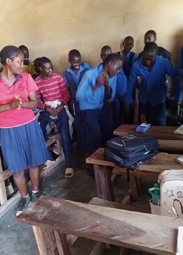 group of students in what appears to be a classroom setting. Most of the students are wearing blue shirts and dark pants or skirts, suggesting a school uniform. One person, possibly a teacher, is wearing a red shirt and a dark blue skirt. The classroom is basic, with wooden desks and benches. Some students are standing and clapping while others are sitting or bending over a desk. There are some bags and books on the desks. The atmosphere seems lively and celebratory, with the clapping and presumably cheering or singing audible. The room has plain, light-colored walls.