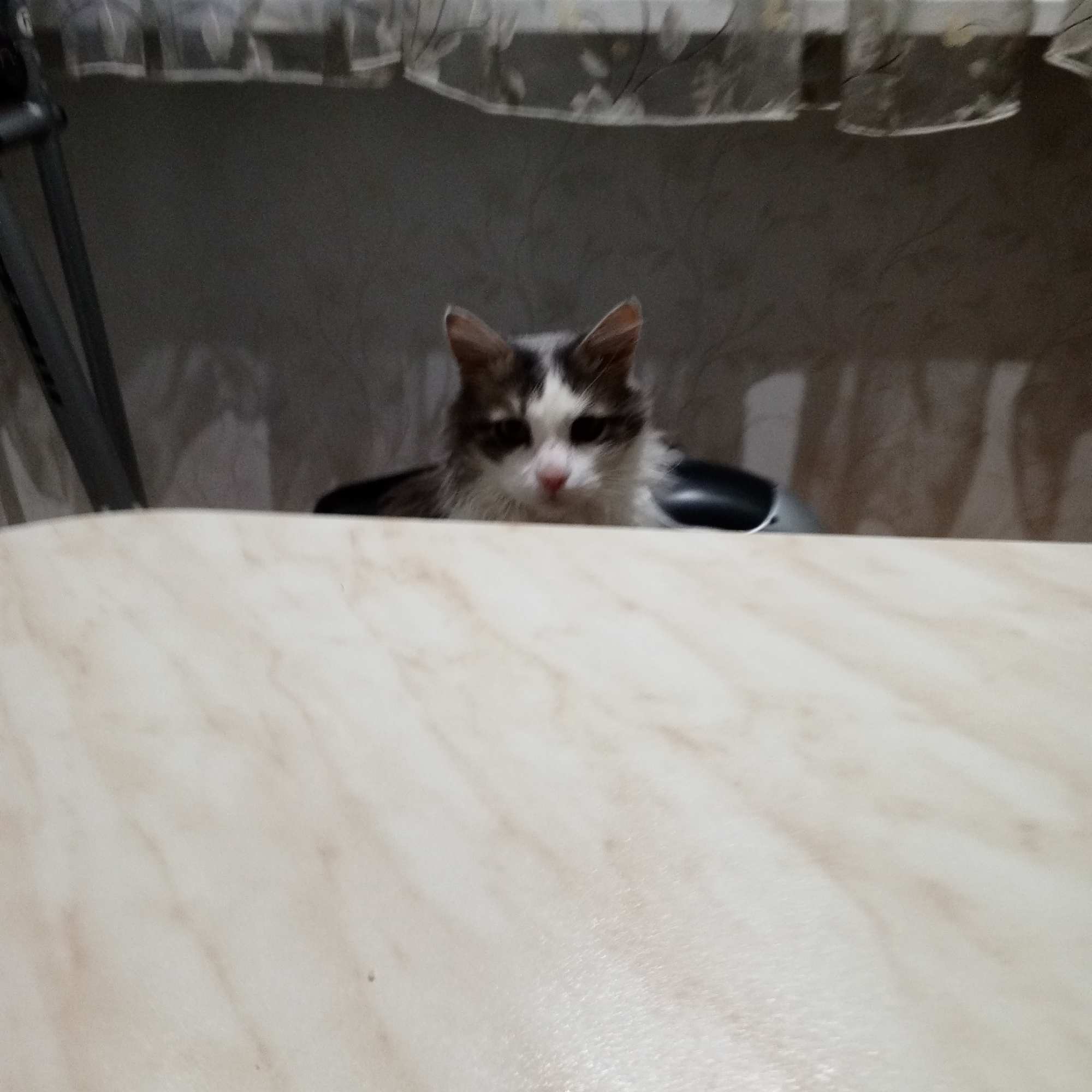 A fluffy, medium-haired cat with white and grey fur sits behind a light-colored, faux-marble-patterned table. Only the cat's head and part of its shoulders are visible above the table's edge. The cat's gaze is directed towards the camera. A dark object, possibly a chair, is behind the cat. The background is a grey wall with shadows cast by window curtains. The image was likely taken indoors in Gremyachinsk, Russia.