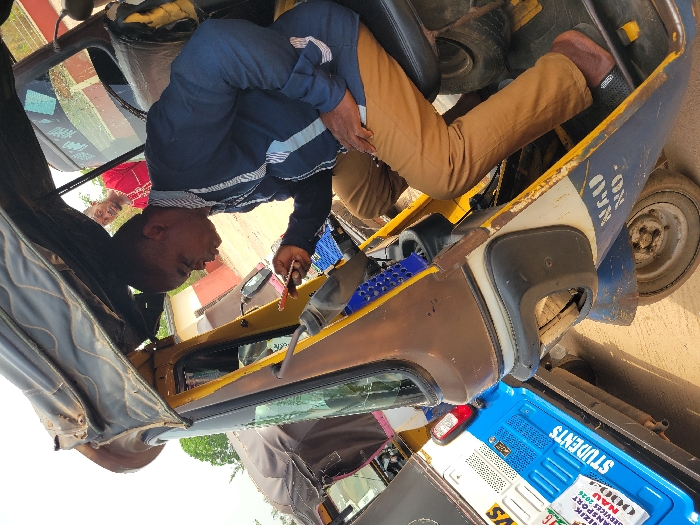 The scene is purportedly set in Candelaria, Colombia, though visual evidence contradicts this assertion. An outdoor shot details a male driver positioned within a three-wheeled auto-rickshaw. The vehicle features a brown, yellow, and blue color scheme with a dark canopy, showing signs of wear, rust, and dirt. The driver, an adult male with dark skin and a shaved head, wears a dark blue long-sleeved shirt with white stripes on the shoulders, tan trousers, and dark slide sandals. He holds a red smartphone in his right hand, directing his gaze downward, with his lips slightly parted. A blue plastic storage basket is visible near the steering column. Partially legible text on the auto-rickshaw's blue lower section reads "NAU NO.". In the background, a second male subject, bearded and wearing a red patterned shirt, is partially visible, looking forward. To the left, a second blue three-wheeled auto-rickshaw is parked, displaying "STUDENTS" in prominent white lettering, alongside "NIZIK TRANSPORT SERVICES 2024" and "NAU". The ground beneath the vehicles is unpaved earth. Distant background elements include sparse vegetation and a building featuring a reddish-brown roofline. The text "NAU" and "NIZIK TRANSPORT SERVICES" visible on the secondary vehicle are strong indicators of a location associated with Nnamdi Azikiwe University in Nigeria, not Candelaria, Colombia.