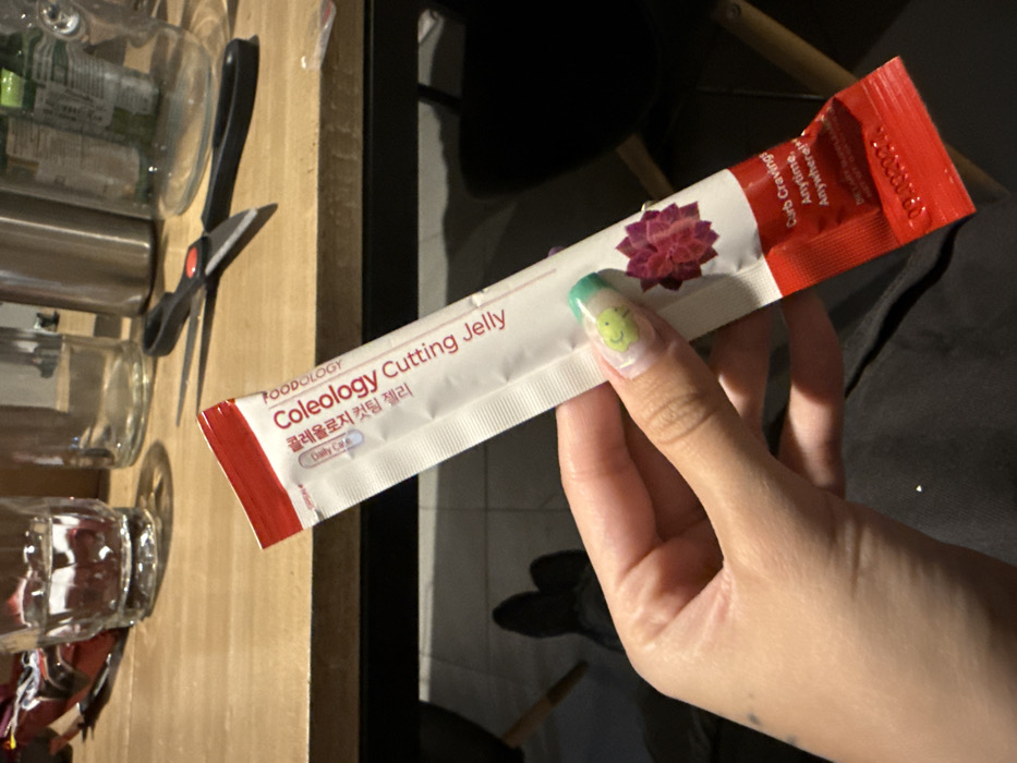 - "A hand holds a white and red Foodology Coleology Cutting Jelly packet with Korean text and "Daily Care" printed on it" by FM-YrxjE3, licensed under CC BY 4.0