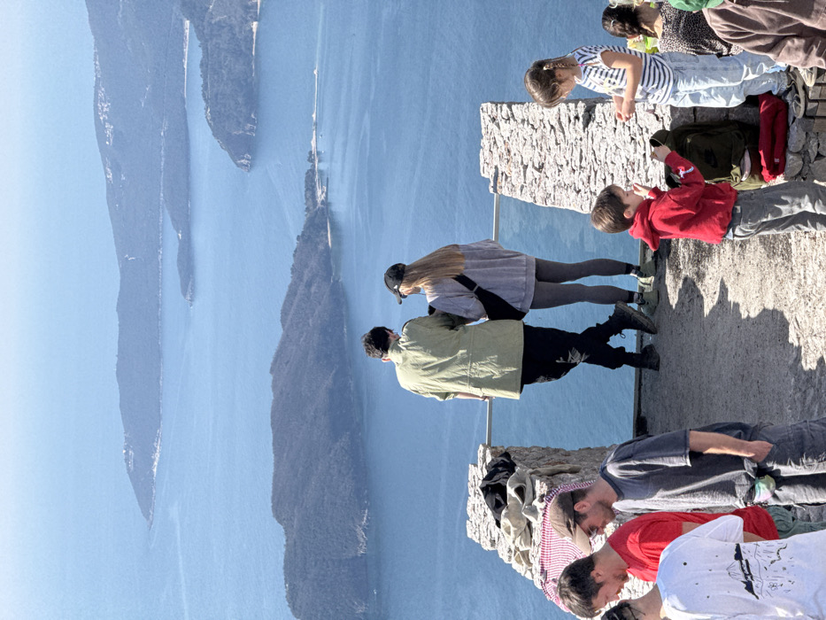 The image depicts an elevated outdoor viewing platform overlooking the Adriatic Sea and surrounding coastline, identified as a location near Bečići, Montenegro. The scene is illuminated by clear daylight under a bright blue sky. In the mid-ground, a man and a woman stand with their backs to the camera, facing the expansive sea view. The man wears a light olive-green jacket, dark trousers, and dark athletic shoes. The woman wears a light grey long-sleeved top, dark grey leggings, and light green athletic shoes; she has a black baseball cap on and a black shoulder bag slung across her body. Both appear to be observing the distant horizon, which features several dark, vegetated islands and distant mainland coastlines. A narrow causeway or pier extends from one landmass into the water, connecting to another small landform in the mid-distance. In the foreground, a group of individuals occupies the paved platform. From left to right: a partially visible person in a white t-shirt with a black graphic; a man with a beard wearing a red t-shirt; another man with a short beard, wearing a brown baseball cap, sunglasses, a dark grey t-shirt, dark shorts/trousers, and a light green fanny pack, with his hands in his pockets, looking downwards. To the right, a young boy, approximately 5-8 years old, in a red hooded sweatshirt and grey trousers, stands facing left, seemingly engaged with an olive-green backpack and a red folded item on the ground beside him. Beside the boy, a young girl, approximately 6-10 years old, with light brown hair in pigtails, dressed in a striped white and dark top and light blue jeans, stands looking down at her hands, appearing to manipulate a small object. Partially visible on the far right are other individuals, one wearing a leopard print top and another in a brown top. The platform features low stone walls forming a barrier; a metal railing is visible atop the left stone wall. Various garments, including a red and white checkered item, are placed on the left stone wall. The ground is a light grey/brown paved or tamped earth surface. Shadows on the ground indicate bright sunlight from the right.