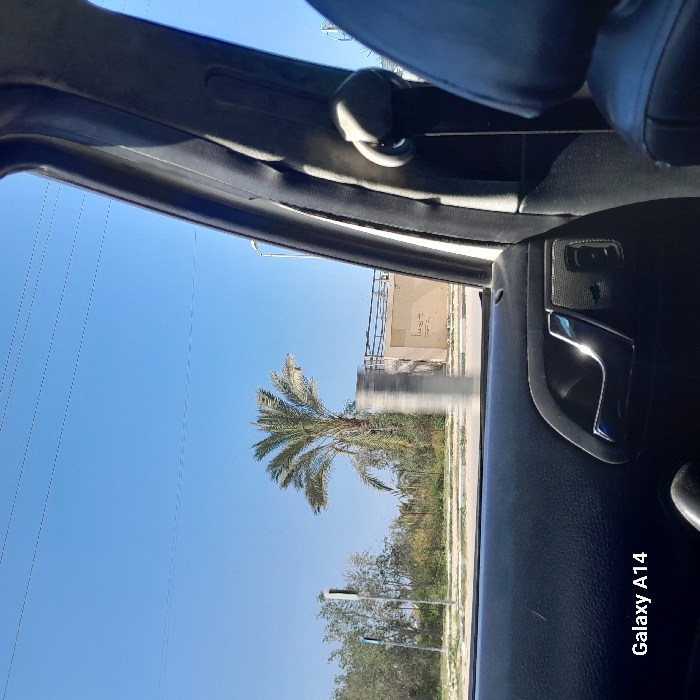 The image presents an exterior view from inside a vehicle, situated in Deir el-Balah, Palestinian Territory. The foreground is dominated by the dark interior components of the vehicle, specifically a passenger-side door panel with a chrome handle and speaker grille on the left, and a dark B-pillar with an attached seat belt mechanism on the right. A "Galaxy A14" watermark is visible in the bottom left corner. Through the window, a sunny outdoor environment is visible. A paved road surface or shoulder lies immediately beyond the vehicle. To the left of the road, sparse green vegetation, including bushes and small trees, is present, along with two light-colored roadside markers mounted on poles. Centrally positioned beyond the road is a mature palm tree with green fronds. To the right of the palm tree, a light-colored concrete wall or bridge abutment is visible, bearing faint markings that appear to be Arabic script or graffiti, topped by a dark metal railing. A vertically blurred object, possibly a pole or a passing structure, partially obscures the view in front of the wall. The background consists of a clear, bright blue sky traversed by at least three thin, dark power lines. No individuals are present in the scene.