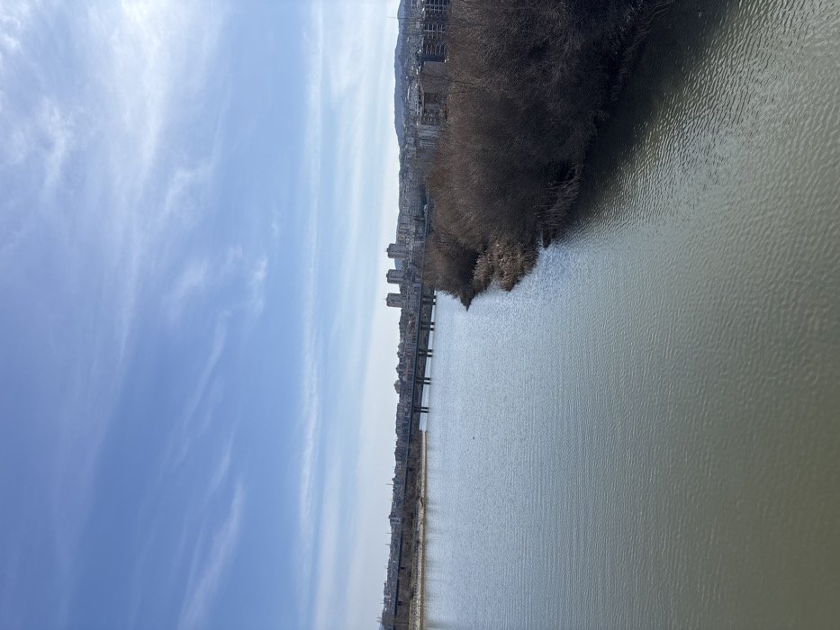The scene depicts a wide view of the Arda River in Kardzhali, Bulgaria, under a bright blue sky with scattered cirrus clouds. The river, appearing calm with minor ripples and a grayish-green hue, occupies the foreground and mid-ground. A multi-span bridge, likely a road bridge with visible supports, extends horizontally across the river in the mid-distance. The right riverbank features dense, bare deciduous bushes and dry reeds. The cityscape of Kardzhali is visible primarily on the right side of the river and in the background, comprising numerous buildings of varying heights, including several prominent multi-story structures. A less vegetated bank with an elevated linear structure runs parallel to the river on the left side of the frame. Distant hills are faintly visible on the horizon behind the city. No individuals, vehicles, or discernible activities are present within the frame.