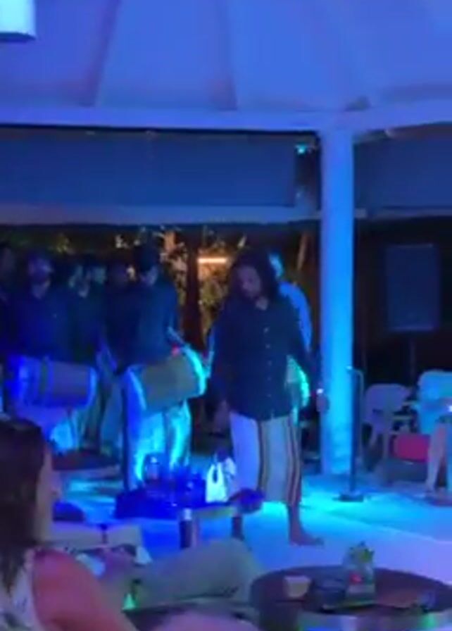 A group of men in a semi-circle play drums and dance to the beat in a well-lit gazebo. They wear black shirts and striped pants or white pants. The gazebo has white posts and a white ceiling with a ceiling fan. Patrons sit at tables and watch the performance. There are tables with drinks, plants, and lamps visible. Lighting includes blue, purple, and green. Trees are visible in the background. One man dances in front of the drumming ensemble.