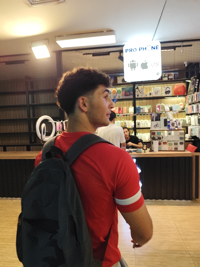 The image displays the interior of an electronics retail store. The specific location within Joubar Municipality, Syria, cannot be visually confirmed from the image. In the foreground, a young male is shown in a right-profile view, facing slightly away from the camera. He has dark, curly hair with faded sides and wears a red short-sleeved shirt featuring two white horizontal stripes on the right sleeve. He is carrying a dark-colored backpack over his shoulders. In the midground, to the right of the primary subject, a second individual wearing a white t-shirt is partially visible, facing away. Behind a dark counter, a third individual in a dark shirt is visible, appearing to be a store employee. Overhead, a prominent, illuminated square sign displays the text "PRO PHONE" along with the Android and Apple logos. The store's interior features wooden shelves on the walls, stocked with numerous electronic accessories, including packaged headphones, phone cases, and various boxed items. A metal grate structure is visible above some shelving units. The store is illuminated by multiple overhead fluorescent lights and some recessed spotlights. The floor consists of light-colored tiles.