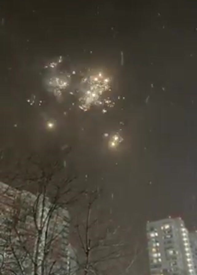 nighttime scene of fireworks being set off amidst falling snow. The camera angle is upward, capturing the fireworks exploding in the dark sky. The fireworks are bright and white, contrasting against the dark background. Snowflakes are visible, adding a layer of complexity to the scene. Below the fireworks, there are buildings visible, likely apartments or residential structures. The buildings are illuminated by streetlights, and bare tree branches are seen swaying in the foreground.