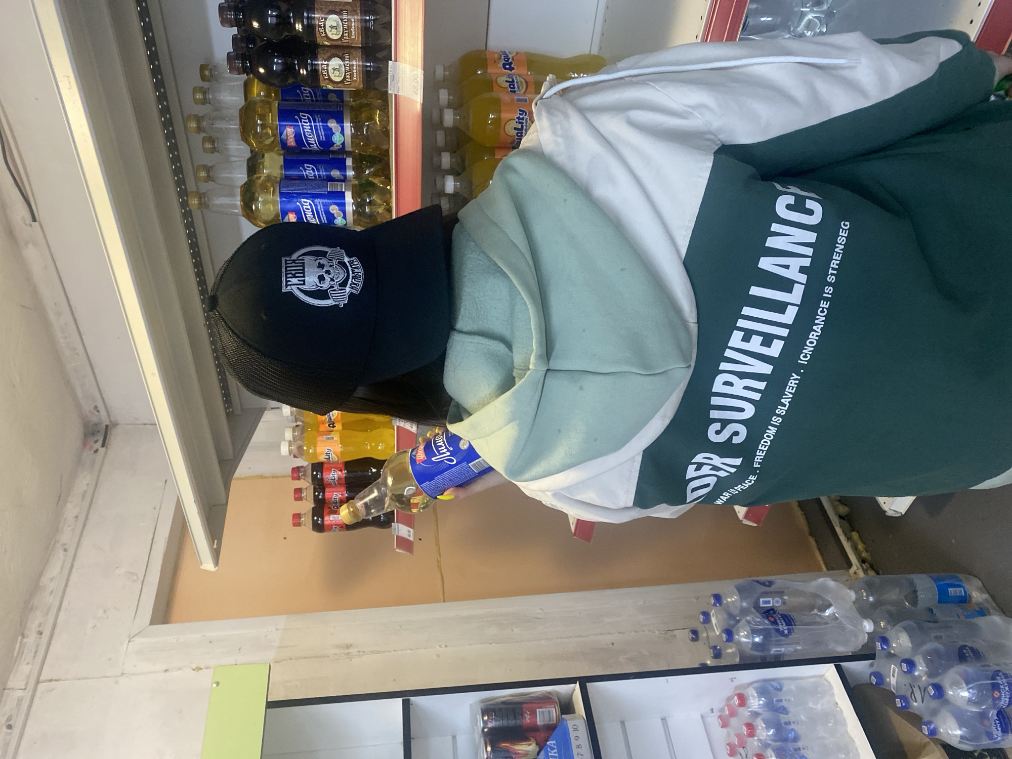 A person wearing a black cap with a skull emblem and a green and white hoodie is reaching for a bottle of "Limonad" soda on a shelf in what appears to be a small shop or market