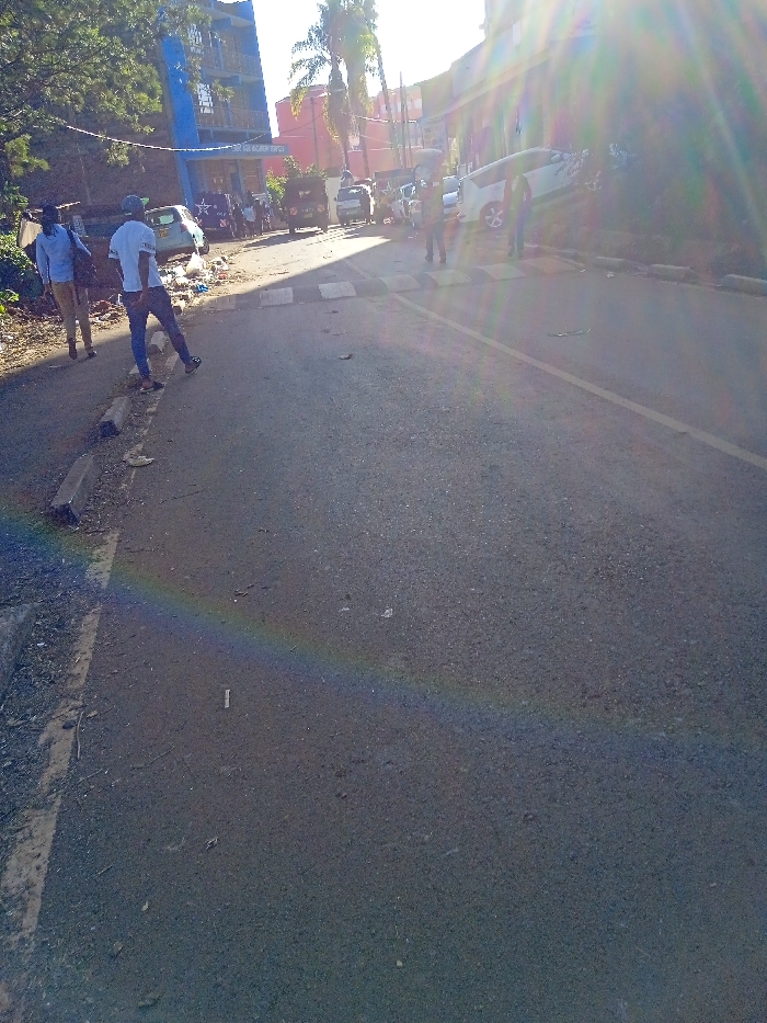 The image displays an urban street scene in Embu, Kenya, captured under strong direct sunlight, causing a significant lens flare in the upper right quadrant and a partial rainbow-like refraction diagonally across the lower left