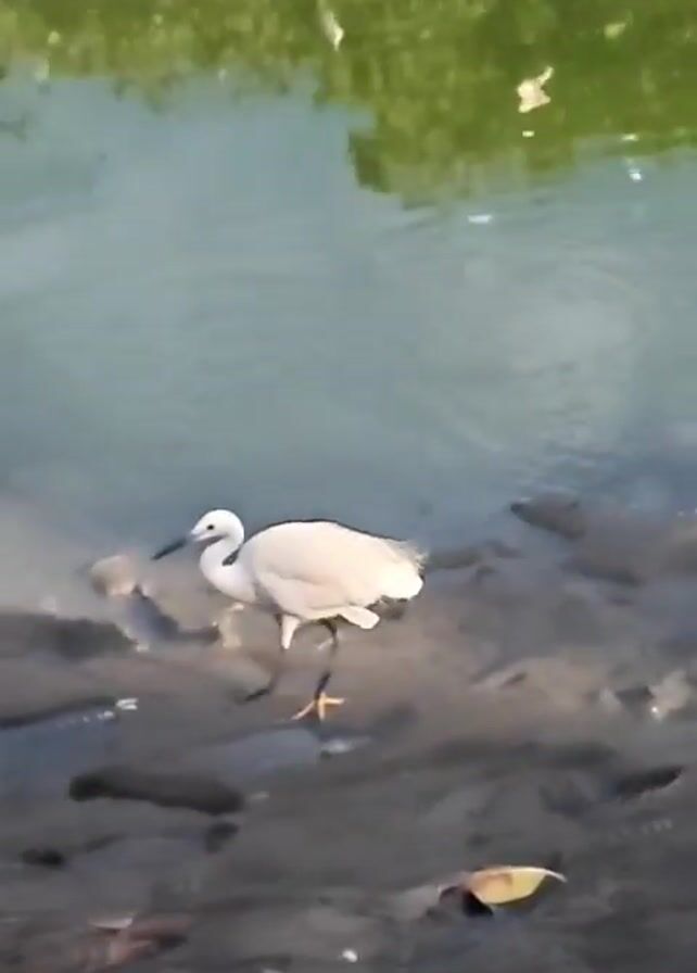 white egret wading in the mud near a body of water. The bird has black legs and a yellow beak. The water reflects green vegetation. The egret walks around in the mud, then bends down to look for food.