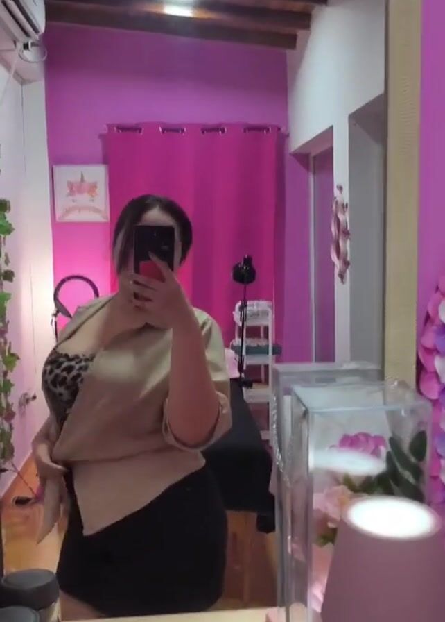 A person stands in front of a large mirror, taking a selfie with a smartphone. The person is wearing a leopard print top, a light beige jacket, and black pants. The room is brightly lit, with a light overhead and a ring light in the background. The walls are painted a vibrant pink color, and a curtain of the same color hangs behind the person. There is a poster with a unicorn on the wall. The room contains various items, including a beauty bed, a cart with supplies, a trash can, coffee condiments, a decorative flower box, and a lamp. The person is holding the phone up to their face, obscuring it in the mirror. The camera is angled slightly upward, providing a full view of the person and the surrounding room.
