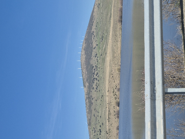 The image displays a panoramic landscape view near Ávila, Spain, specifically depicting the Embalse de Fuentes Claras (Fuentes Claras Reservoir) with the Sierra de Ávila in the background. In the immediate foreground, a metallic silver-grey highway guardrail spans horizontally across the bottom third of the frame, with visible bolts and connecting plates. Behind the guardrail, sparse, bare, brown vegetation is present. A calm body of water, the Fuentes Claras Reservoir, occupies the midground, exhibiting a dark blue-grey hue on its surface, reflecting the clear sky. Its far bank features dry, light brown terrain with patches of low, green and brown shrubs. Dominating the background is a large, undulating mountain range, likely part of the Sierra de Ávila, specifically a peak like Alto de La Serrota. Its lower slopes are covered in scattered green and brown scrubland and small trees, while the upper ridges appear more barren. Along the crest of this mountain, a series of approximately nine slender, white wind turbines with visible blades are uniformly spaced, forming a wind farm. The sky above is a uniform, bright, cloudless blue, indicating clear weather. No people or active interactions are visible in the scene. The overall lighting suggests a bright daytime setting.
