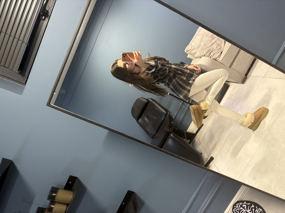 A female subject, with long dark brown hair and wearing glasses, is depicted taking a mirror selfie in an interior commercial establishment in Yerevan, Armenia. She wears a dark plaid long-sleeved shirt, white textured leggings, and tan fur-lined boots, holding a peach-colored smartphone. Her reflection in the large, dark-framed mirror shows her posing with her left leg raised. The reflected background features a teal wall with two black floating shelves holding decorative cylindrical objects. A black adjustable examination or procedure chair is visible to the reflected left, and a portion of a light-colored upholstered sofa is to the reflected right. The floor is light-colored tile, with a black and white patterned mat in the lower left foreground.