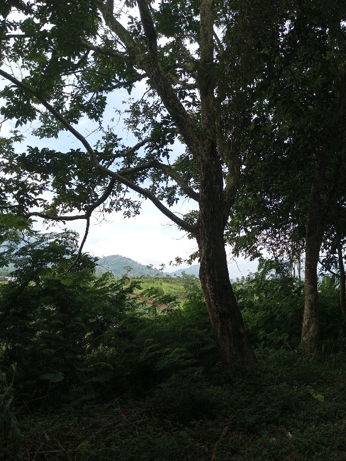 This image displays a natural landscape situated in Kandenuwara, Sri Lanka. The foreground and mid-ground are dominated by dense, dark green foliage and undergrowth, with a prominent tree trunk on the right side of the frame. This tree features textured bark and extensive branches with numerous dark green leaves that extend across the upper portion of the image, partially obscuring the sky. Beyond the immediate vegetation, an open area is visible, leading to a series of verdant, rolling hills in the distant background. The sky is light blue with scattered white cloud formations. No individuals, animals, or man-made structures are discernible within the scene. The environment is characterized by natural, undisturbed vegetation under daylight conditions.
