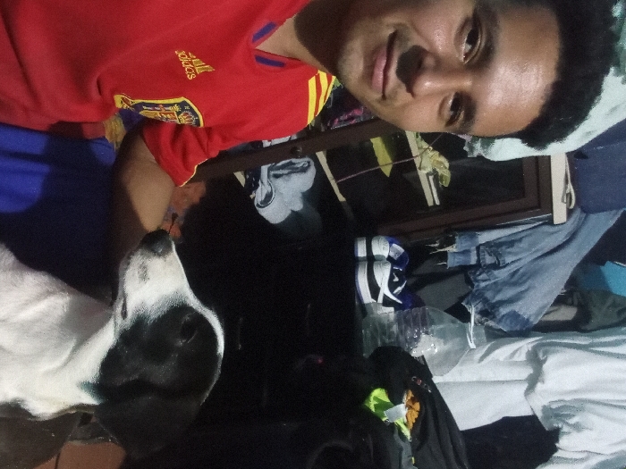The image displays an indoor scene in Cujisal, Venezuela, featuring one male human subject and one canine subject. The male, positioned on the left, is an adult with dark, short, curly hair and a light complexion. He wears a red long-sleeved athletic shirt with yellow accents, an Adidas logo, and a crest resembling that of the Spanish national football team. He is looking directly at the camera with a neutral to slightly smiling facial expression. To his right, a black and white dog is visible, with black patches on its head and ears, and a white snout, forehead, and body. The dog is oriented to its right, away from the camera. The background depicts a residential interior with various objects. On the left, a dark wooden shelf unit holds unspecified items. To the right, a large clear plastic water bottle, partially filled, sits next to a pair of white and purple athletic shoes on a dark surface. Clothes, including a light blue denim jacket and a white shirt, are visible in the background, indicating a somewhat disheveled environment. No direct interaction between the man and the dog is captured, as their gazes are directed differently.