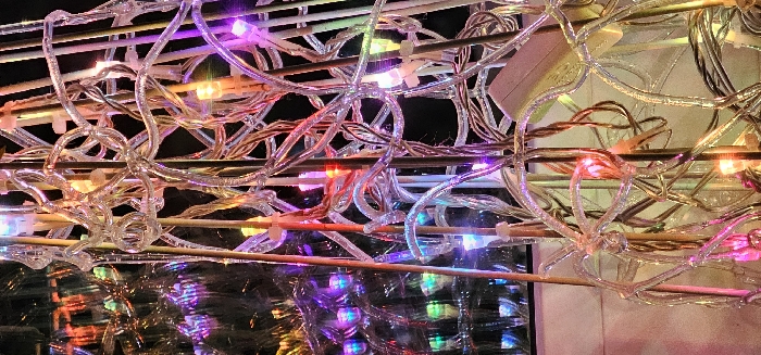 An abstract, close-up view showcases a complex arrangement of clear, tangled light strings intertwined with a rigid grid of horizontal poles. Miniature, colorful bulbs illuminate the scene with hues of red, green, purple, and yellow. Reflections of these lights appear in a mirrored or reflective surface below. The overall effect is a jumbled, but vibrant, display of light and transparent form.