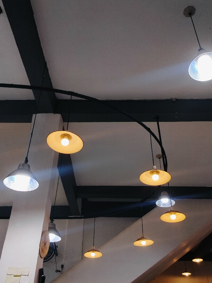 A view looking up at a series of industrial-style ceiling lights. Most lights are metal shades and hang from thin wires or a curved metal rod. The ceiling is white with dark gray beams running across. Some lights shine brightly, while others are dimmer. Overall, the scene is an indoor space with functional, exposed lighting fixtures.