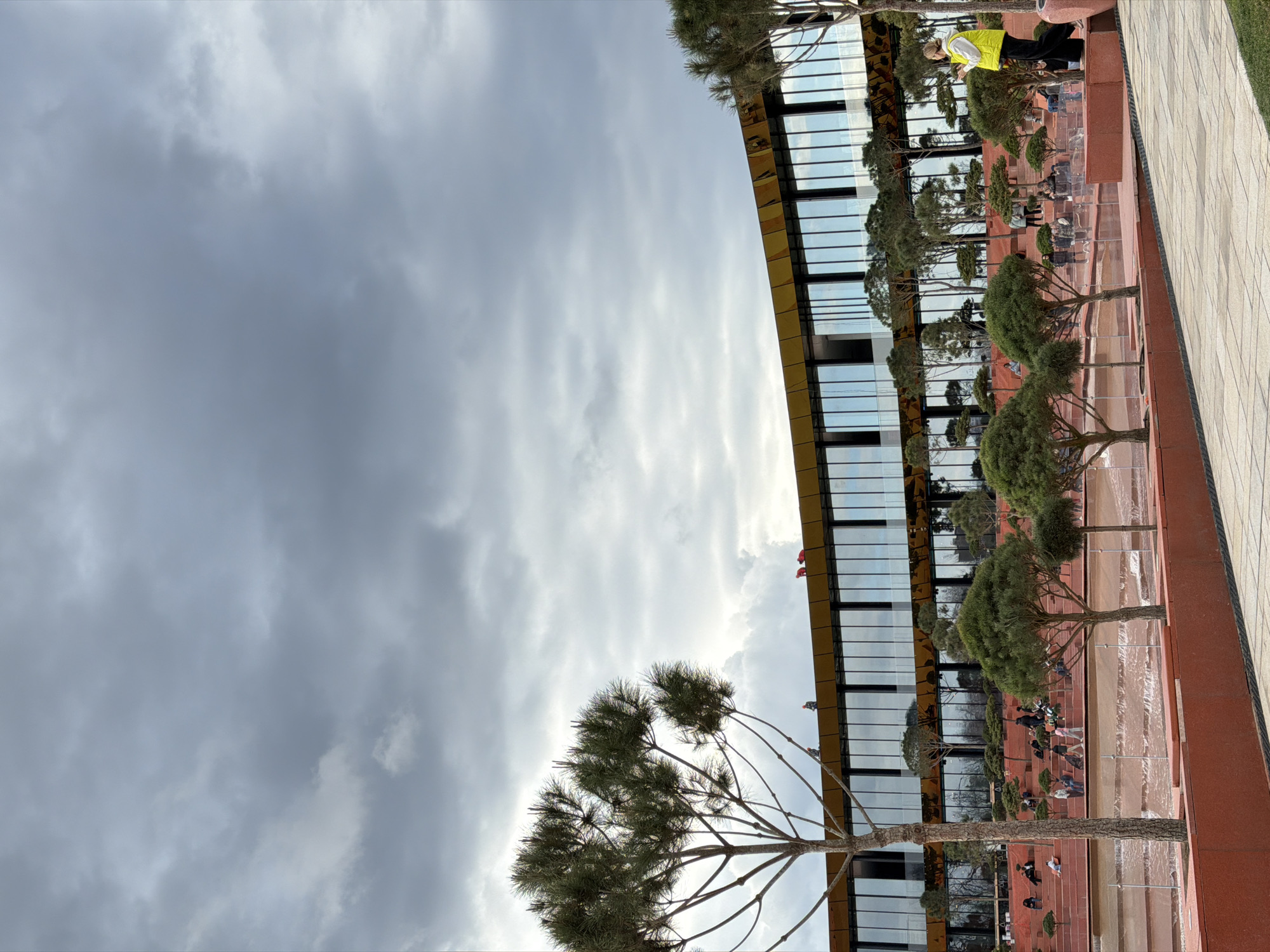The image captures a view of a modern building with a glass facade in Krasnodar, Russia. A line of trimmed trees is planted in a reddish-brown planter that runs along the building's base. These trees are thin, bare-branched, with rounded green canopies. The building's facade reflects the cloudy sky, which dominates the left side of the frame. The sky is overcast with heavy, gray clouds. In the foreground, there is a paved area with people walking and sitting. A person in a yellow vest is visible near the edge of the frame. The ground surface is reddish-brown, with some sections filled with shallow water. The scene appears to be an urban park or public space near the building.