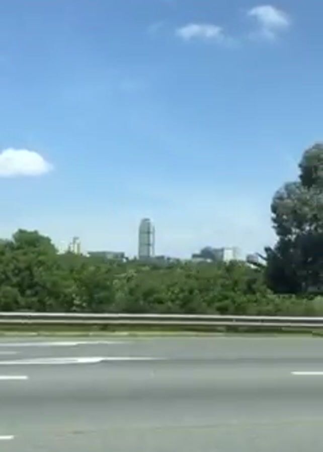car driving along a highway. There is a line of trees and bushes separating the highway from the background, which includes some buildings in the distance. The sky is blue with some clouds. As the car drives along, the video shows a few billboards on the side of the highway. One billboard shows a green gift box, while another shows three bottles of Jameson Irish Whiskey. Several other cars are on the highway.