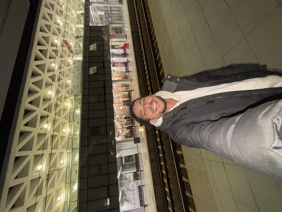 At a subway platform, a man smiles at the camera. He is dressed in jeans, a white hoodie, and a dark jacket. Behind him are the train tracks, and a modern building with a geometric facade pattern is visible. The building's windows showcase a glimpse of what appears to be shops or businesses inside. The scene is lit artificially, suggesting it's nighttime. The overall composition is angled, giving the image a dynamic feel.