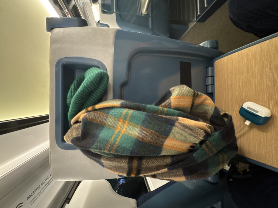 An overhead shot displays a blue and gray airplane seat. A green beanie sits in a storage compartment on the side of the seat. A plaid scarf in shades of green, blue, tan, and brown rests partially on the beanie and partially on the pull-down tray table. On the tray table, next to the scarf, is a blue and white earbud case. The scene is brightly lit, likely from cabin lighting.