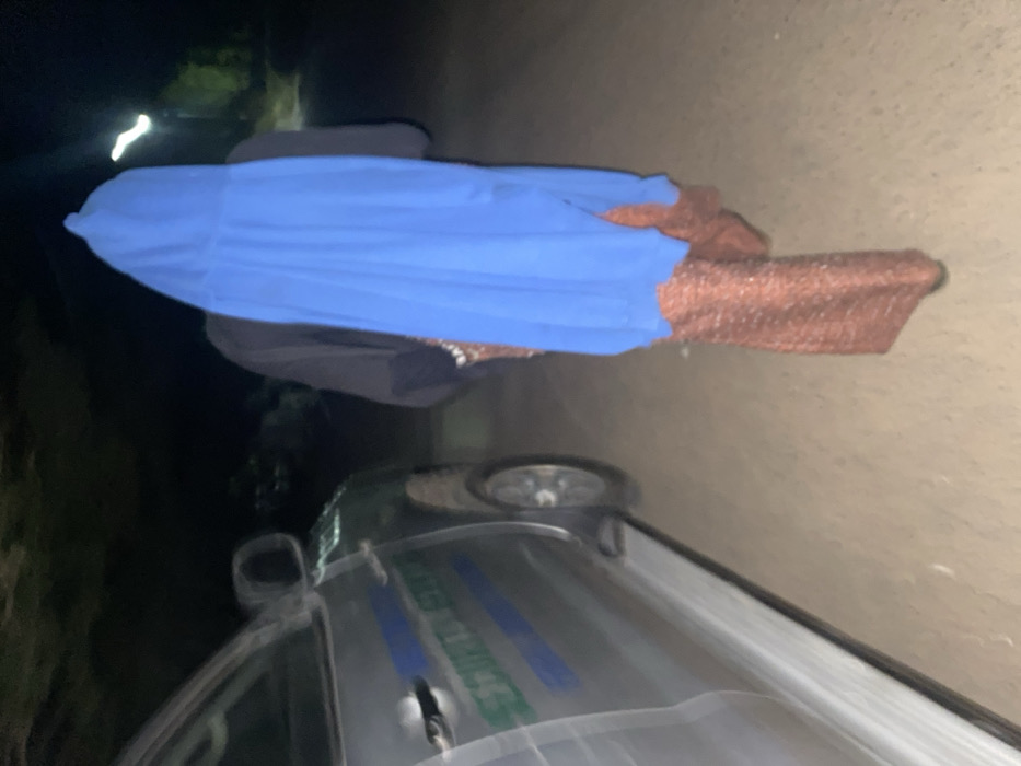 n overturned car on a dimly lit road. The vehicle is silver with blue stripes. A person covered by a blue sheet and a brown blanket is lying on the ground near the car. The scene appears to be an accident site. The surroundings are dark, with some faint light visible in the distance.